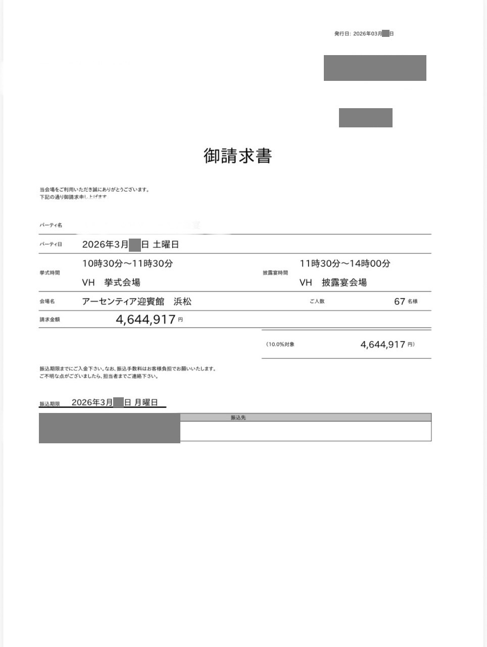 ※料金実例では申込金などを含む会場に支払った"総額"を表示しています。また、料金明細画像の項目名をもとに独自の基準で分類しています。