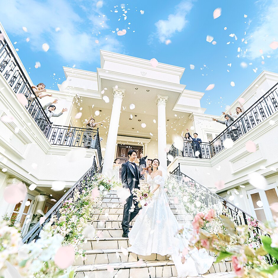 チャペルへと続く大階段は、多くの花嫁を魅了してきた大人気のスポット。夢にまで見たフラワーシャワーもここならより素敵に実現する。また、ゲスト全員とのにぎやかな記念撮影もおすすめだから、スタッフに相談を。