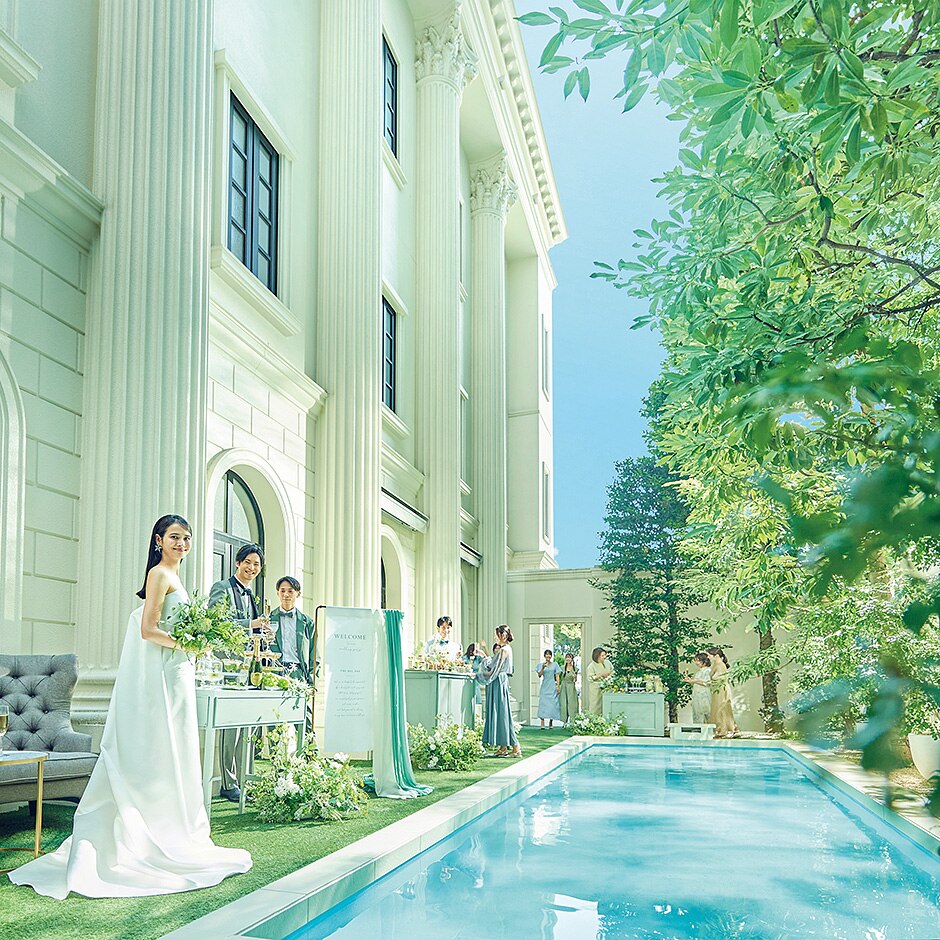 プール付きガーデンとパーティ会場は自由に行き来OK!座りっぱなしではなく動きのあるパーティを楽しんで。貸切だから、その場にいるのは、主役のふたりと招待したゲストだけ。誰にも邪魔されない贅沢なひとときを。