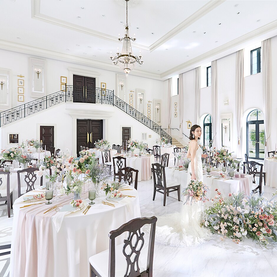 大きな窓から自然光が降り注ぐ広々とした会場は、両サイドにのびる大階段とシャンデリアが優雅さを演出。パーティの幕開けは、ゲストの視線を集める階段入場。新郎に優しくエスコートされる姿はまさにプリンセス!