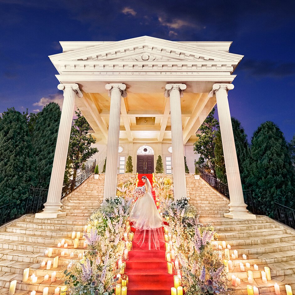 空の色が少しずつ移り変わる夕刻からのナイトパーティは、オシャレな先輩花嫁から大人気!憧れが集う大階段では、よりいっそうドラマチックなウエディングシーンを叶えることができ、特別な思い出になるはず。