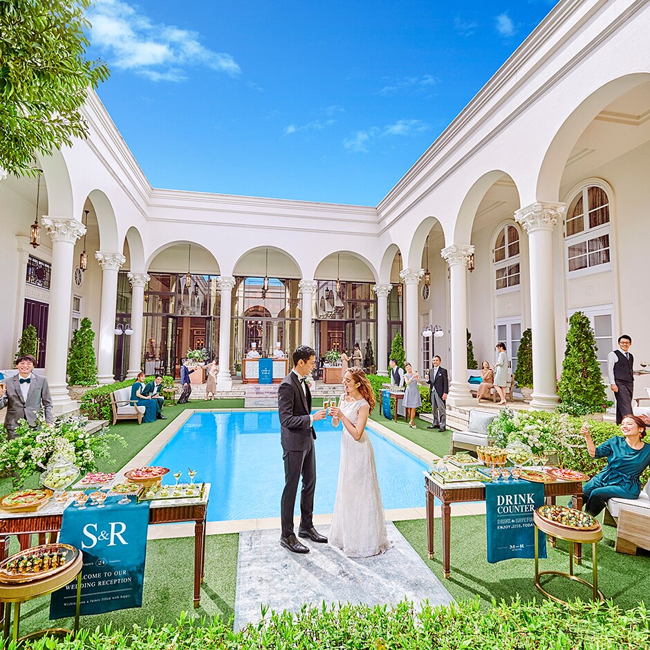 スタイル異なる2つの貸切邸宅には、どちらにも開放的なプールガーデンが付いている。煌めくプールに青空がうつり込む開放的な空間をふたりとゲストで独占。ふたりらしい演出などを実現して、特別な1日を過ごして。