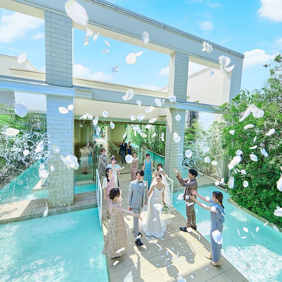 水音と光が響き合い、ゲストを非日常へといざなう空間。自然の息づかいを感じる中、清らかで温かな誓いを。