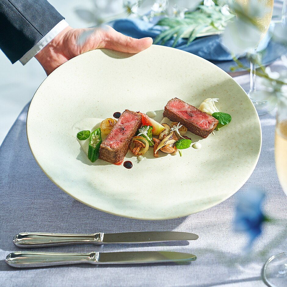 開放感あふれる絶景も、料理を彩るエッセンス。リゾート感あふれる空間で、特選牛を使用した贅沢なコースを試食して。非日常なロケーションと美食が融合する、ニーズ静岡ベイならではの至福の時間をゲストに贈ろう
