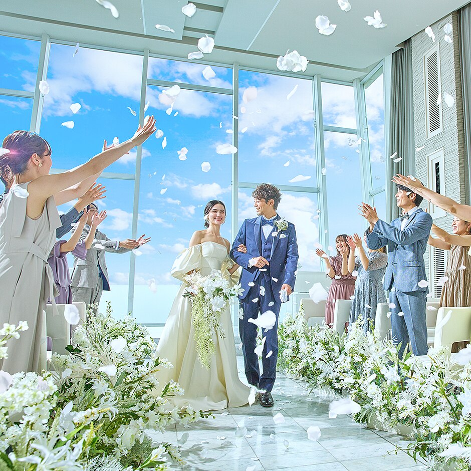 チャペルの扉を開けると、輝くガラスの祭壇、その先にはどこまでも広がる空と海の絶景がふたりを迎える。柔らかい陽光と空と海の青さが花嫁姿を引き立て、「自分史上最高に美しい花嫁になれた」と先輩花嫁から好評!