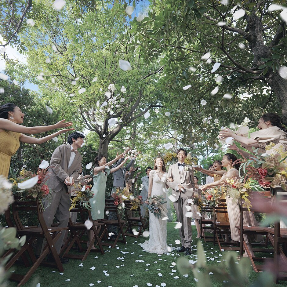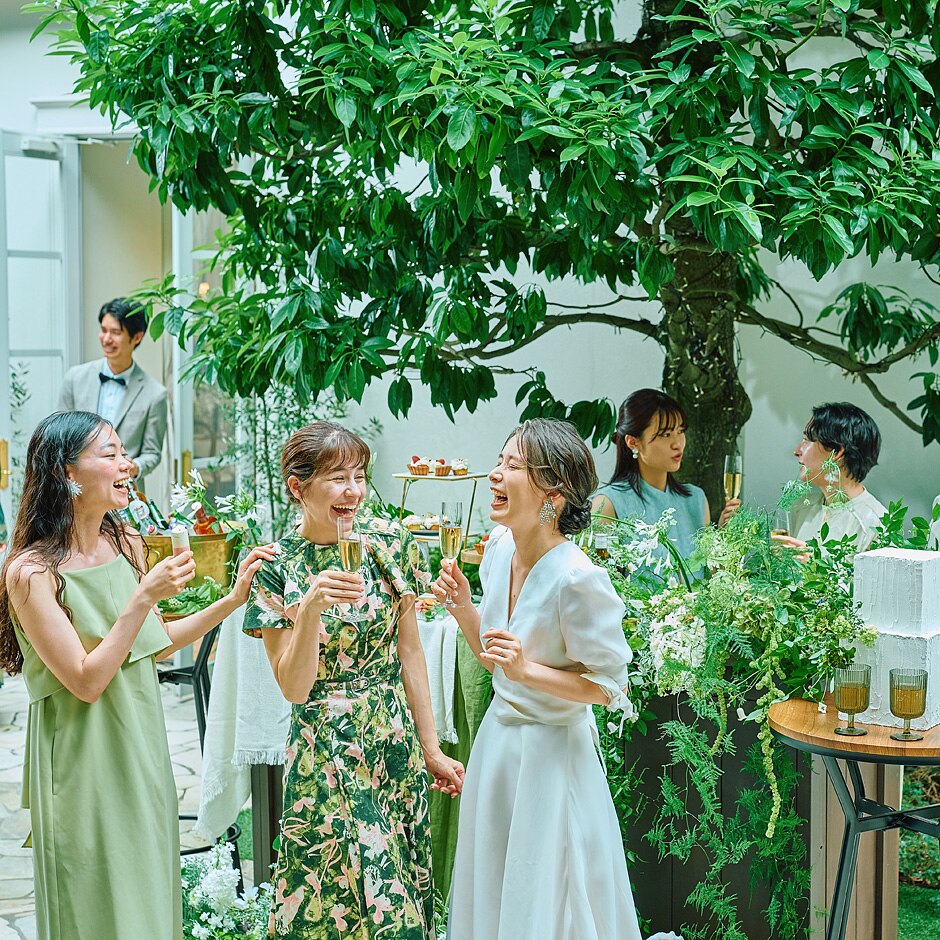 披露宴会場の扉を開くと目の前に広がるのは、森をそのまま持ち込んだような木々溢れるガーデン。ゲストと笑い合う自然なショットも絵になるから、一生の宝物になる写真や映像をたくさん撮ろう。