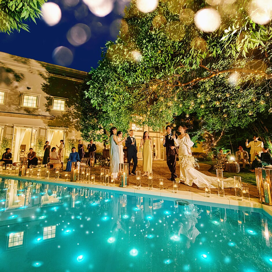 爽快なプールやガゼボがあるガーデンで描くワンシーンは、とびきりオシャレな記念日を演出する。ゲスト達からも「素敵!」と歓声があがるはず。肩の力を抜いて、みんなで遊びに来たような一日を。