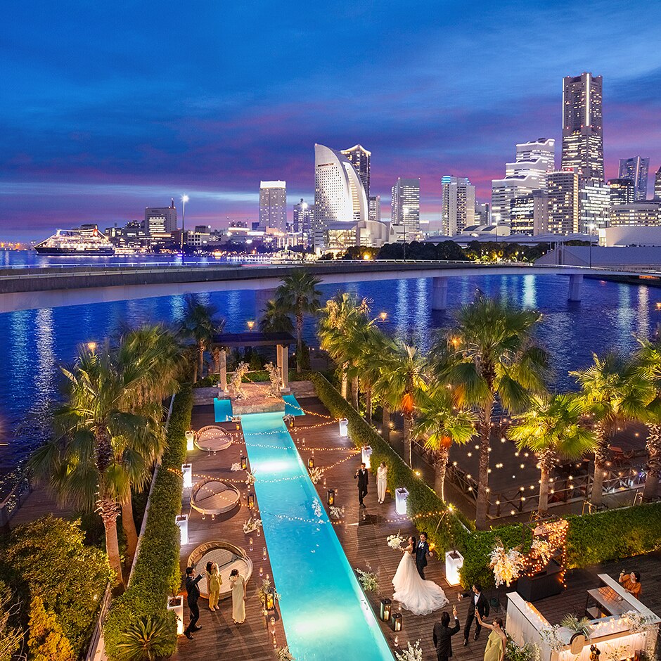 喧騒から離れ、ヤシの木と海に囲まれた隠れ家のような貸切邸宅。ふたりを祝福するかのように心地よい潮風が包み込み、対岸に広がるみなとみらいの街並みにゲストから歓声が上がるほど。きらきらと輝く景色を眺めながら記憶に残るウエディングを!
