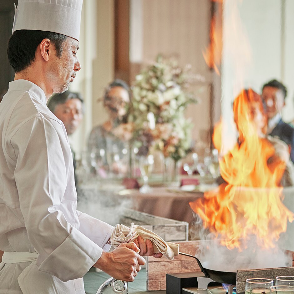 出来立て熱々にこだわったお料理です。T&Gの会場は披露宴会場とキッチンが隣り合う設計。本格フレンチでありながら、日本の四季折々のおいしさを厳選して取り入れたおもてなしをご用意しています。