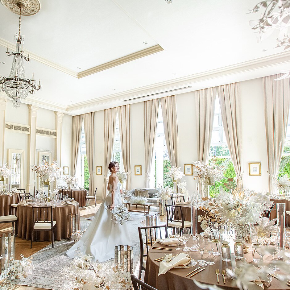 トレンドのナチュラルコーディネートもマッチするシンプルデザインのパーティ会場
