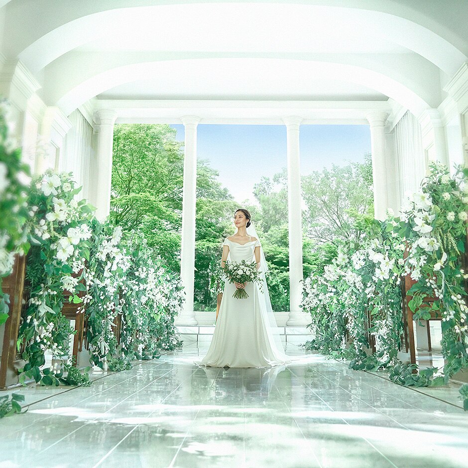 ガーデンにそびえ立つ独立型のチャペル。透明感溢れる白で統一していて、祭壇奥の色鮮やかな緑が誓い合うふたりの姿を印象的に彩る。透き通るような空気感に一目惚れする花嫁も多いそう。心温まるセレモニーを。