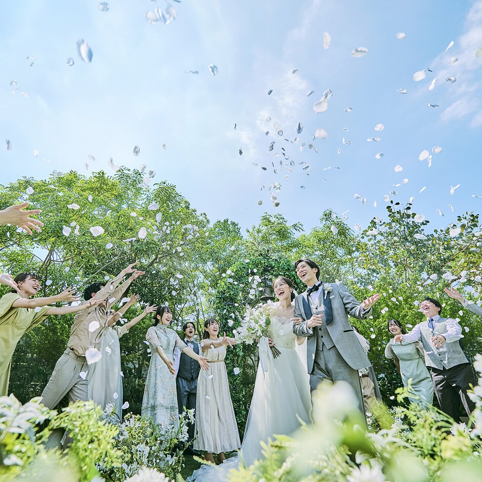 会場には青空広がるプライベートガーデンを併設。待ち時間を退屈させないためのウェルカムスペースにしたり、フォトブースを設けたりと活用方法は様々。プランナーと相談しながら、ふたりらしい空間を創り上げて。
