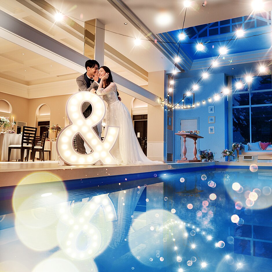 円山郊外に佇む緑に囲まれた貸切邸宅。自然を背景にロケーションフォトやプール付き屋内テラスや新設されたシャンデリア大階段で、二度と味わえない特別体験を。