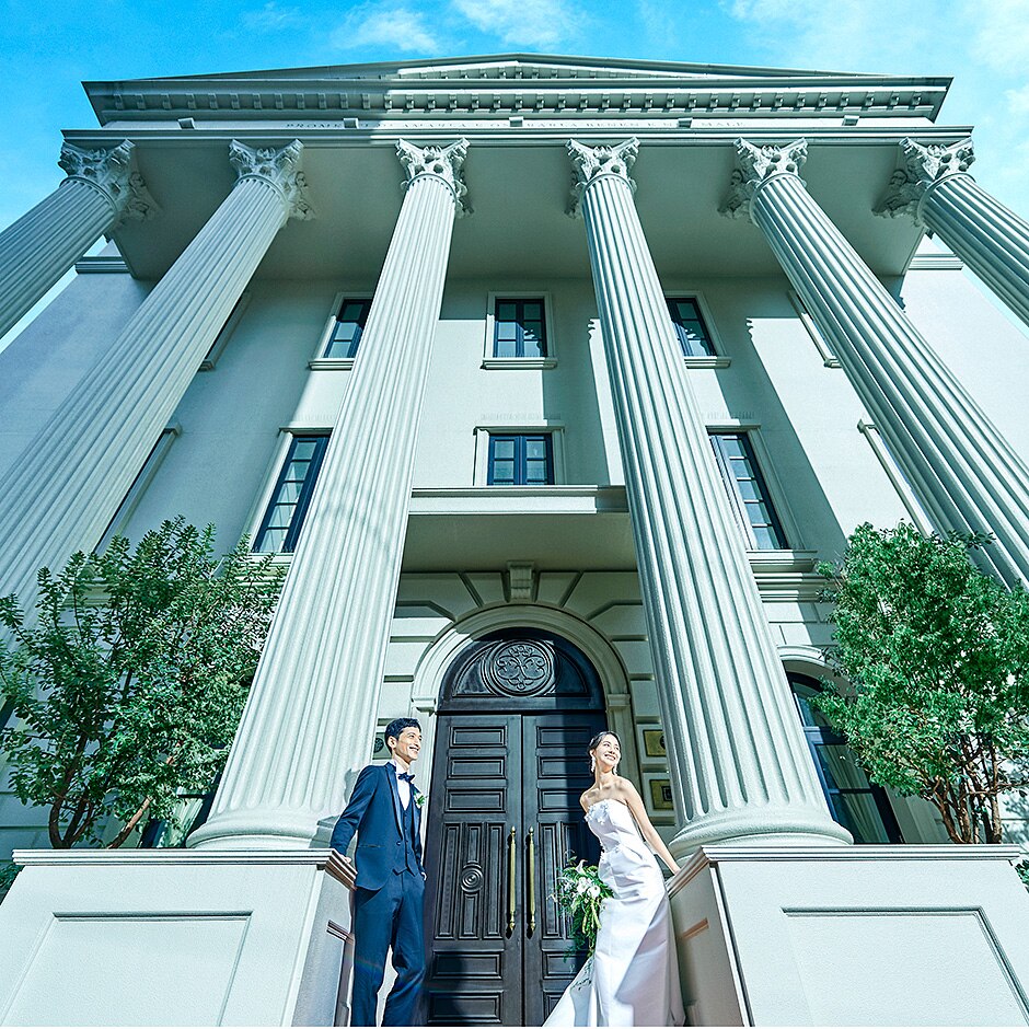 新幹線が停まる静岡駅から徒歩約7分、石田街道をまっすぐ進んだ先に佇む白亜の迎賓館を選んだふたり。「貸切でオリジナルの結婚式をしたいとは思っていましたが、具体的には何も決めていなかったので、白が基調のこの会場なら、どんなドレスや装飾も似合うと思いました。重視していた料理を試食できたことも決め手です」。