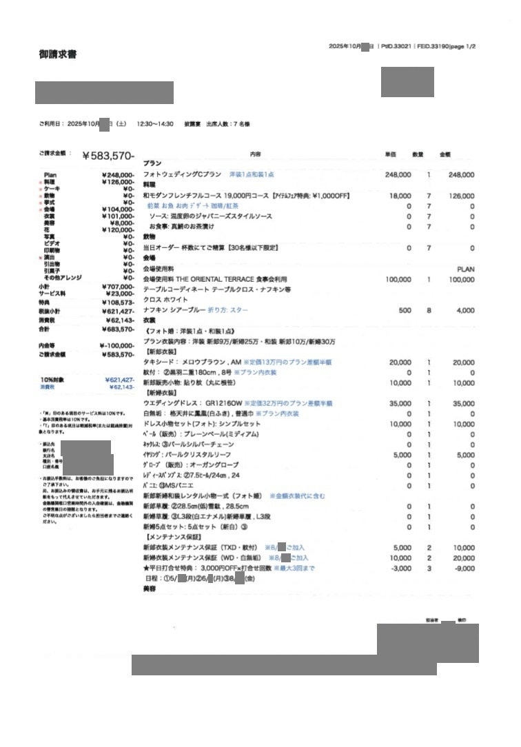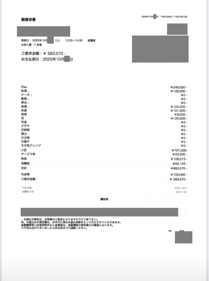 ※料金実例では申込金などを含む会場に支払った"総額"を表示しています。また、料金明細画像の項目名をもとに独自の基準で分類しています。