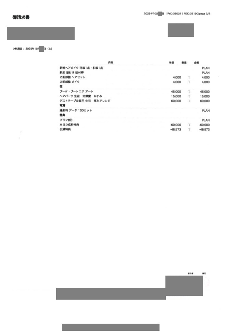 ※投稿された金額情報は、日取り、申込みのタイミングや会場の空き状況等によって異なるため、最終費用明細の項目や金額をもとにした、式場との価格交渉や追加サービス等の要望はご遠慮ください。