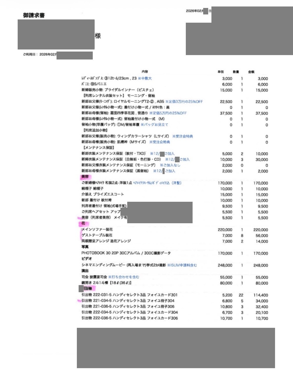 ※料金実例では申込金などを含む会場に支払った"総額"を表示しています。また、料金明細画像の項目名をもとに独自の基準で分類しています。