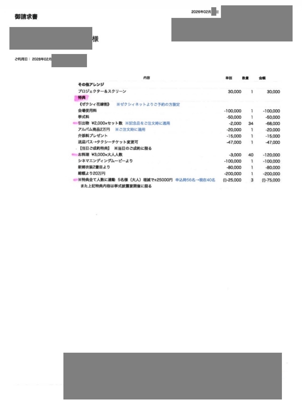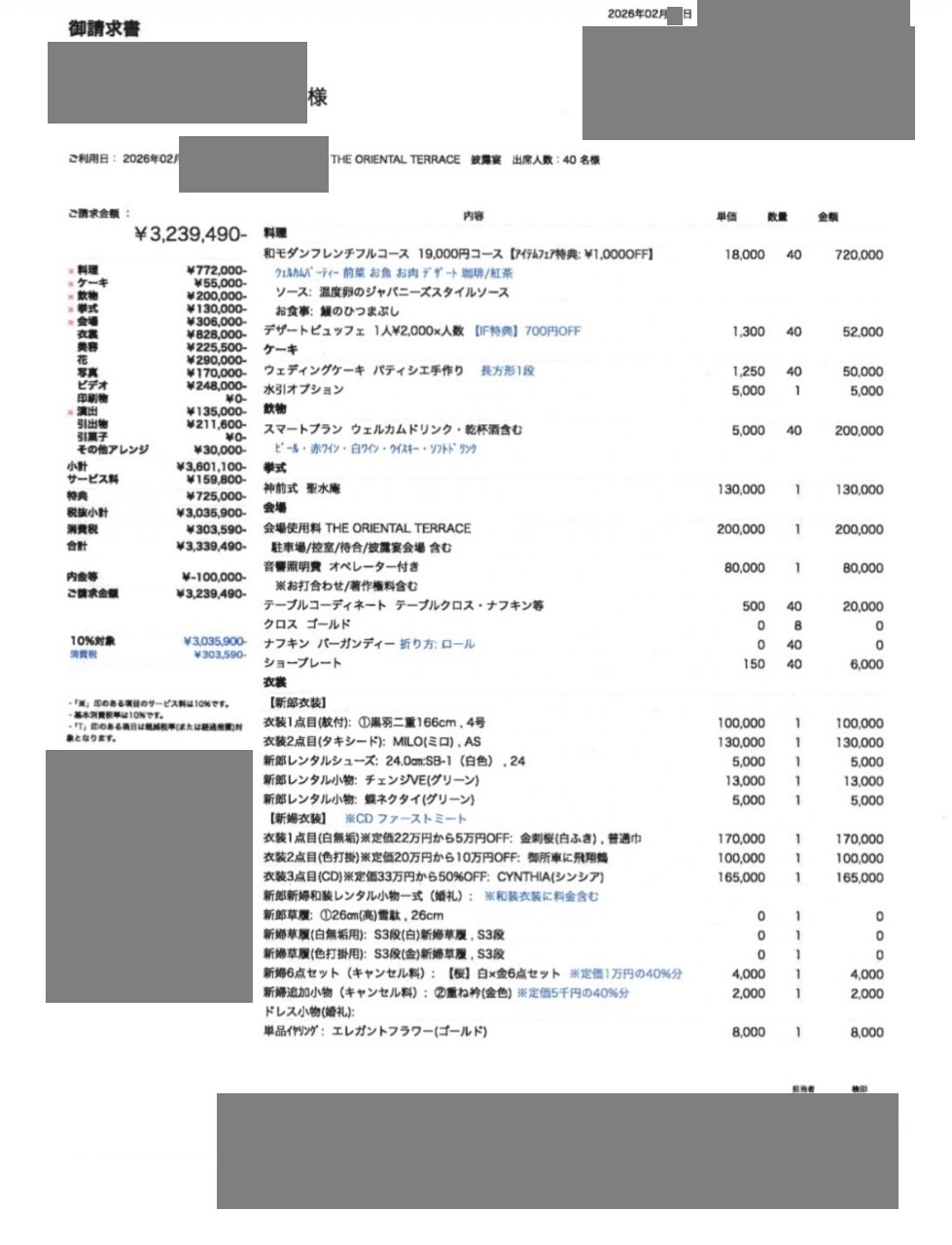 ※投稿された金額情報は、日取り、申込みのタイミングや会場の空き状況等によって異なるため、最終費用明細の項目や金額をもとにした、式場との価格交渉や追加サービス等の要望はご遠慮ください。