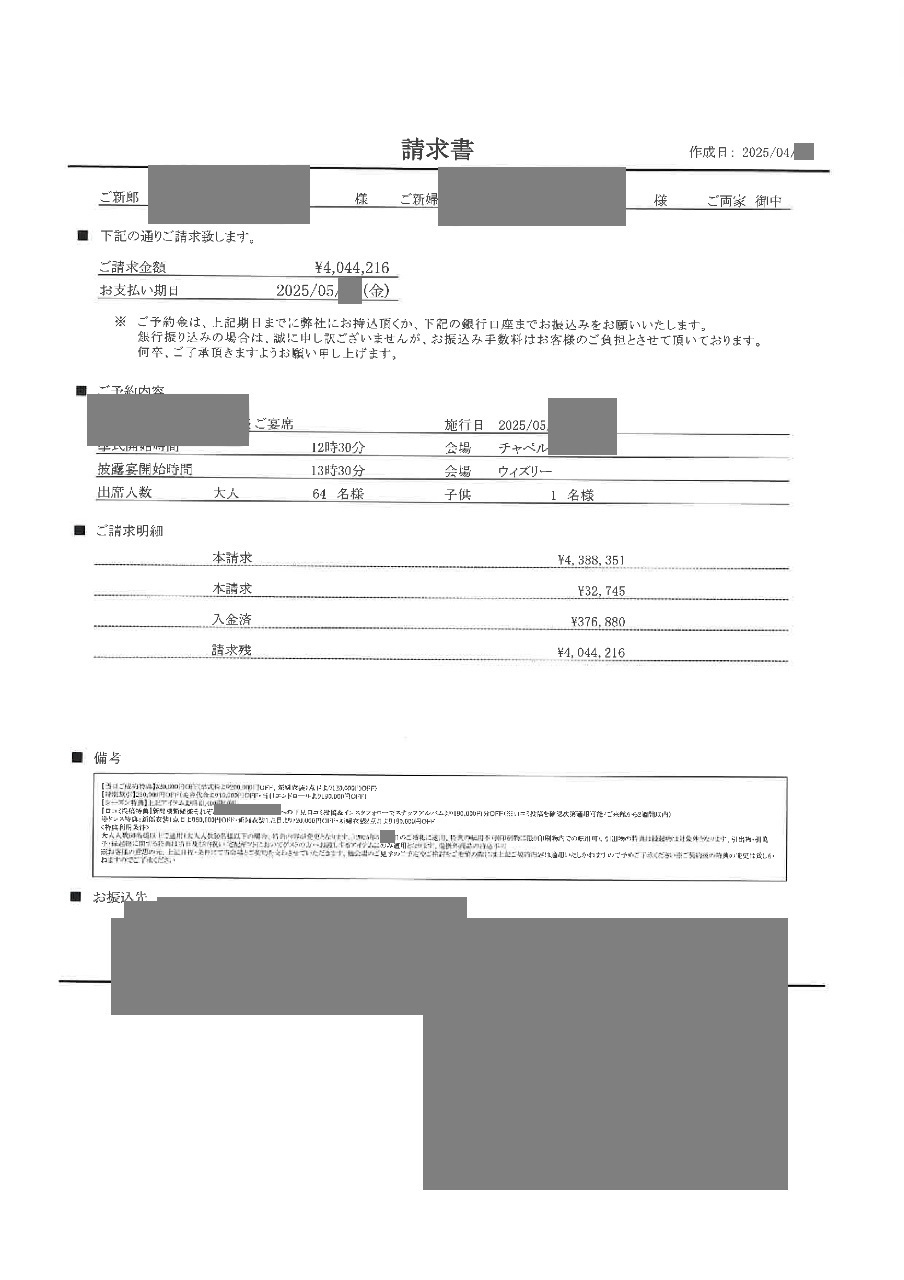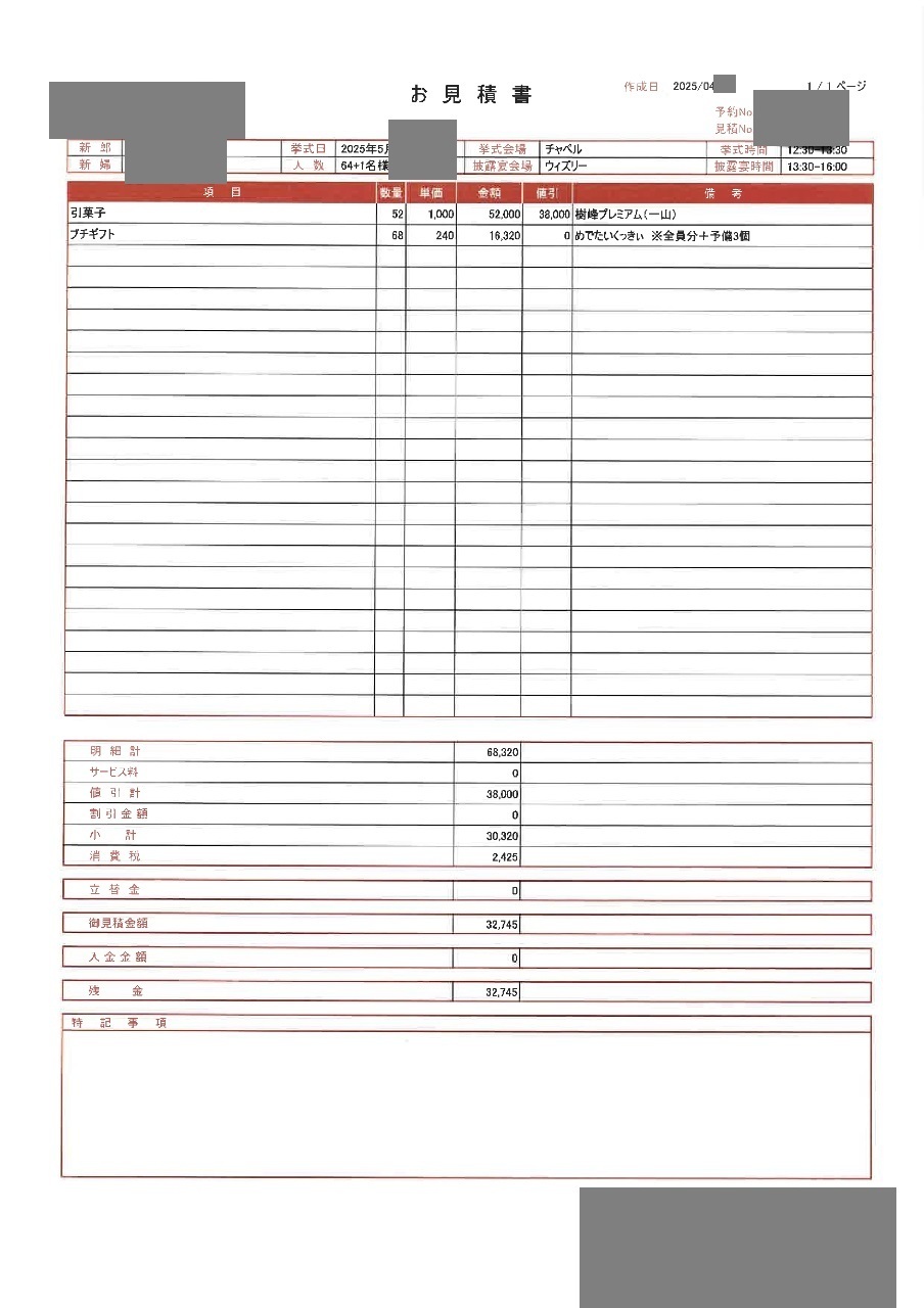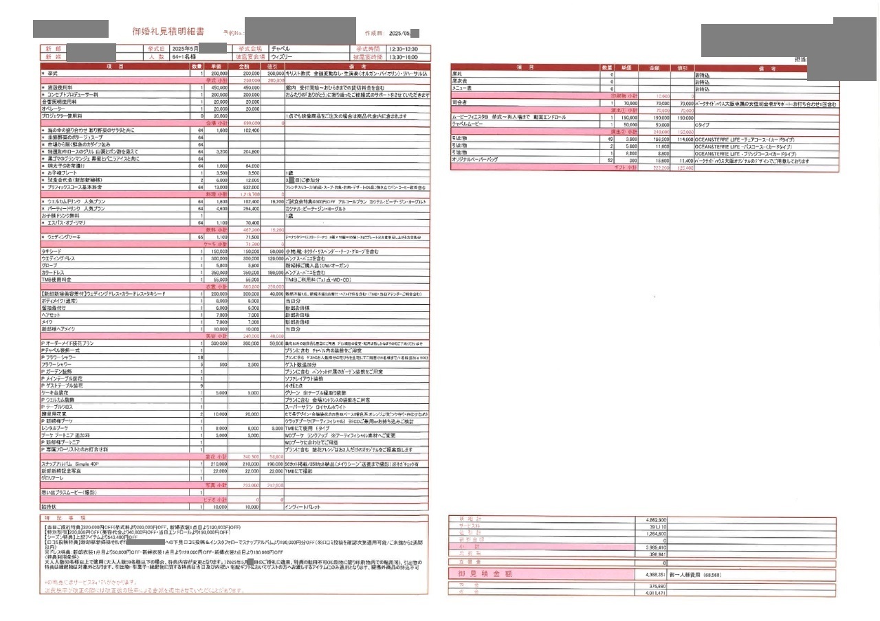※投稿された金額情報は、日取り、申込みのタイミングや会場の空き状況等によって異なるため、最終費用明細の項目や金額をもとにした、式場との価格交渉や追加サービス等の要望はご遠慮ください。