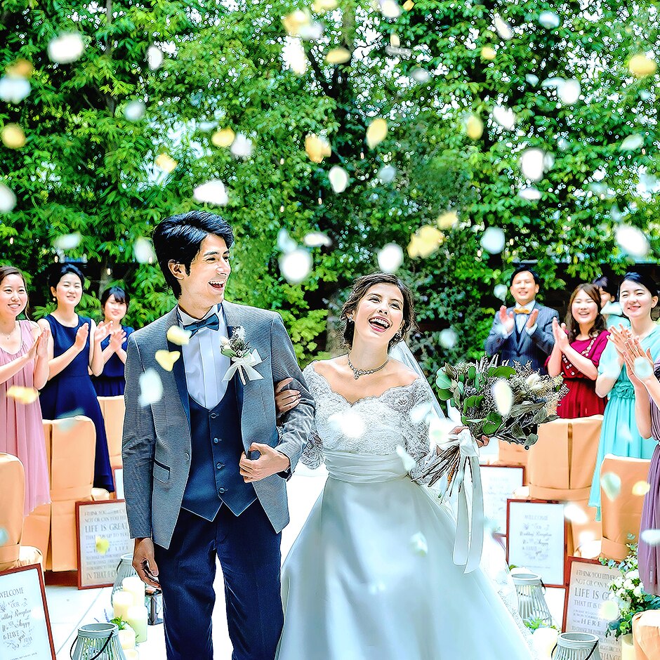 やわらかな陽光と緑、そしてあたたかいゲストの祝福に包まれて祝福をうけるガーデン挙式 -