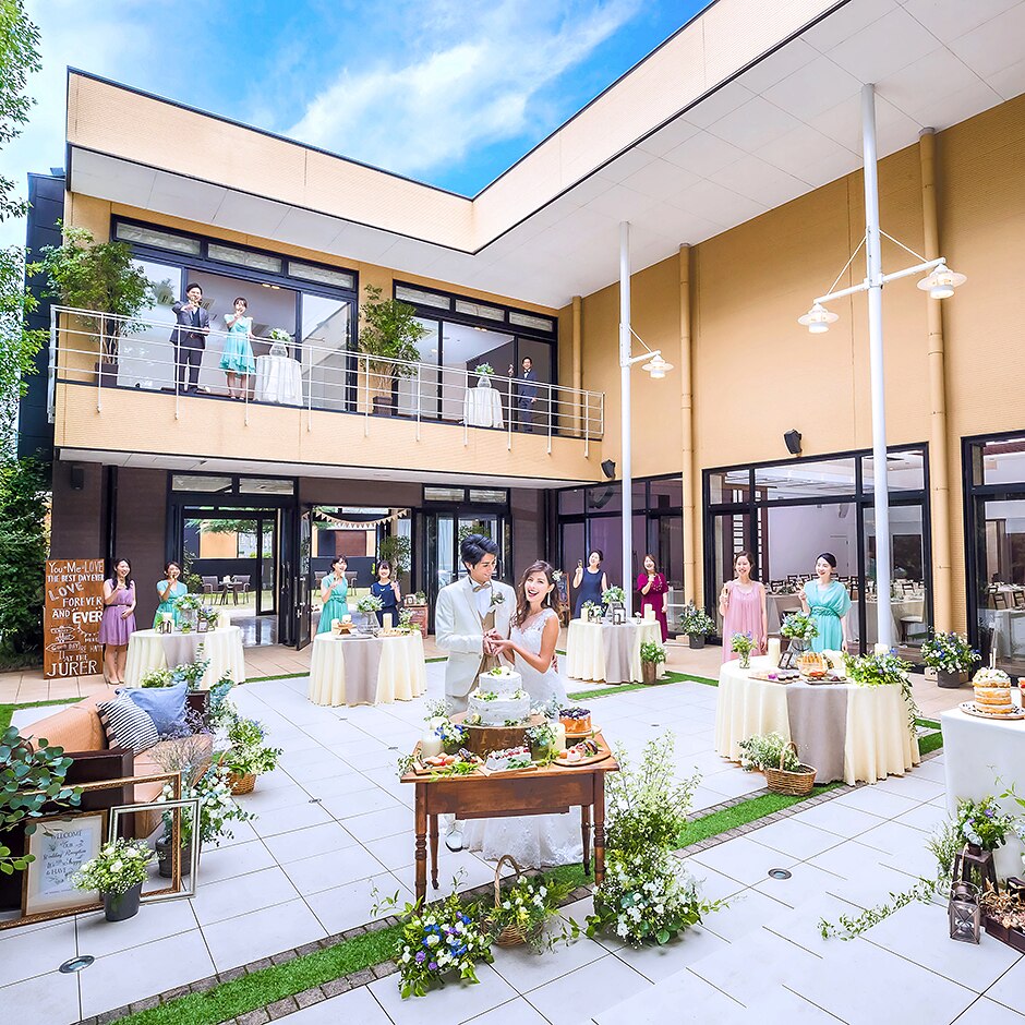 木目調で上質感あるプライベートガーデン付きパーティ会場。自由に行き来しながら開放的な時間を過ごそう! -