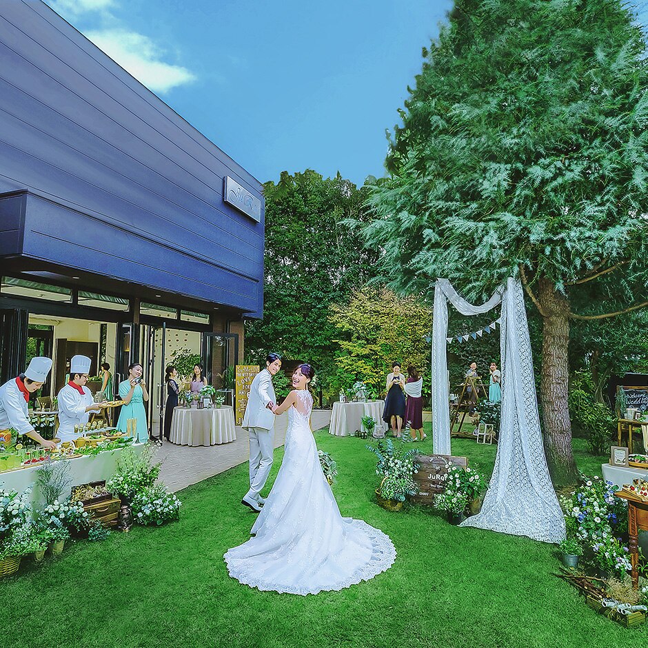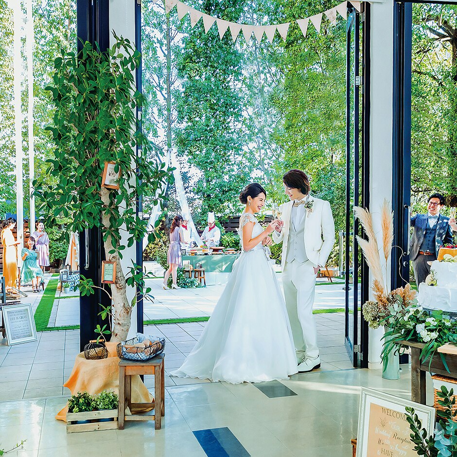 挙式の後は緑と自然光が共存する開放的なガーデンでウェルカムパーティを楽しもう! -