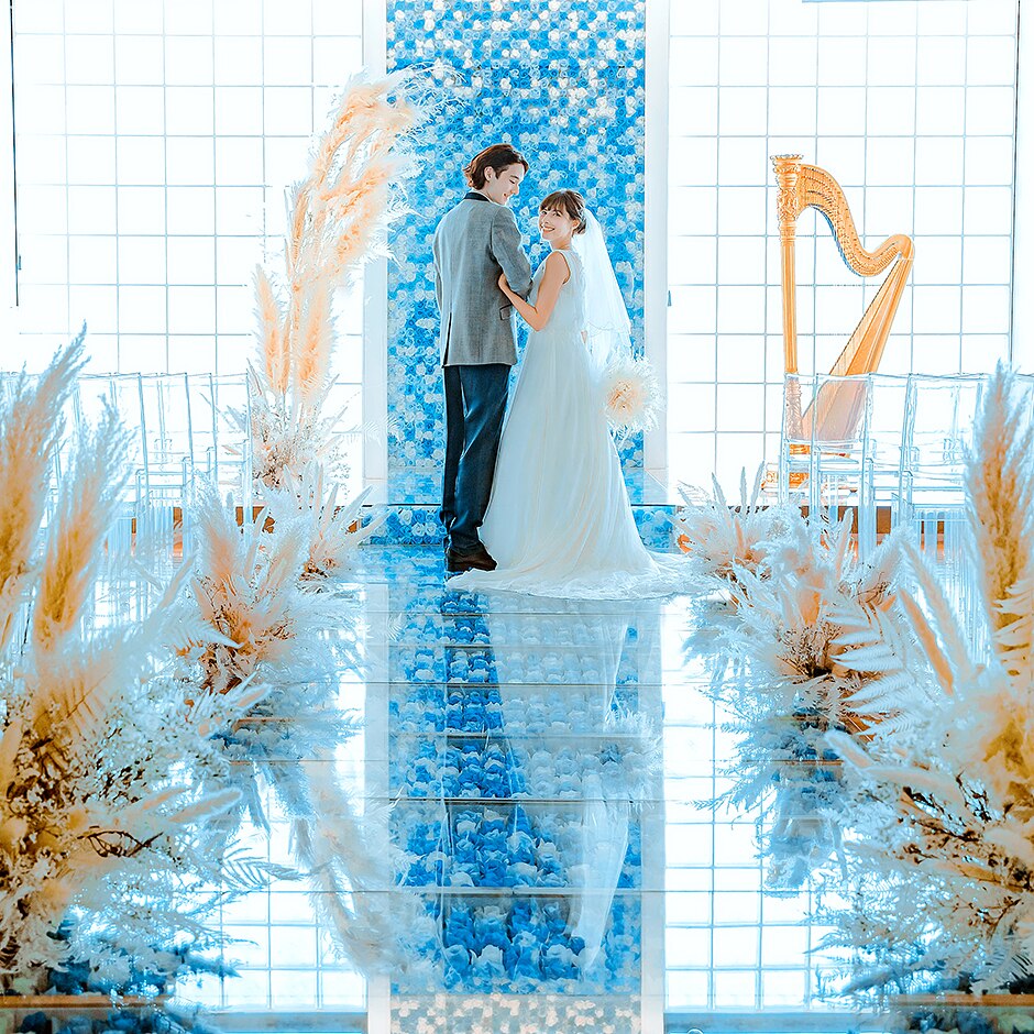 「未来」を意味する青をモチーフにしたバージンロードがふたりの永遠の誓いを祝福してくれる -