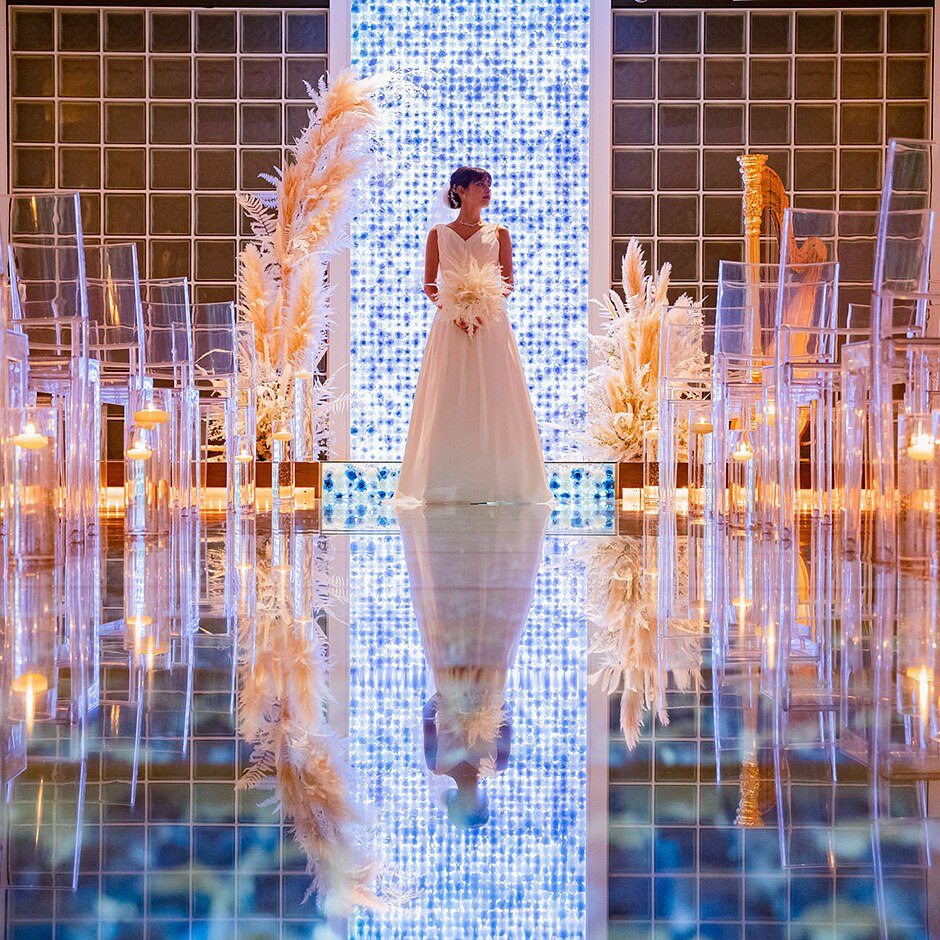 「奇跡」「夢かなう」の花言葉をもつ青いバラと、ガラスの透明感が印象的なバージンロードに純白のドレスが映え、穏やかなハープの音色が式を包み込む。ライトアップによって、さらに厳かな雰囲気になる二面性も魅力