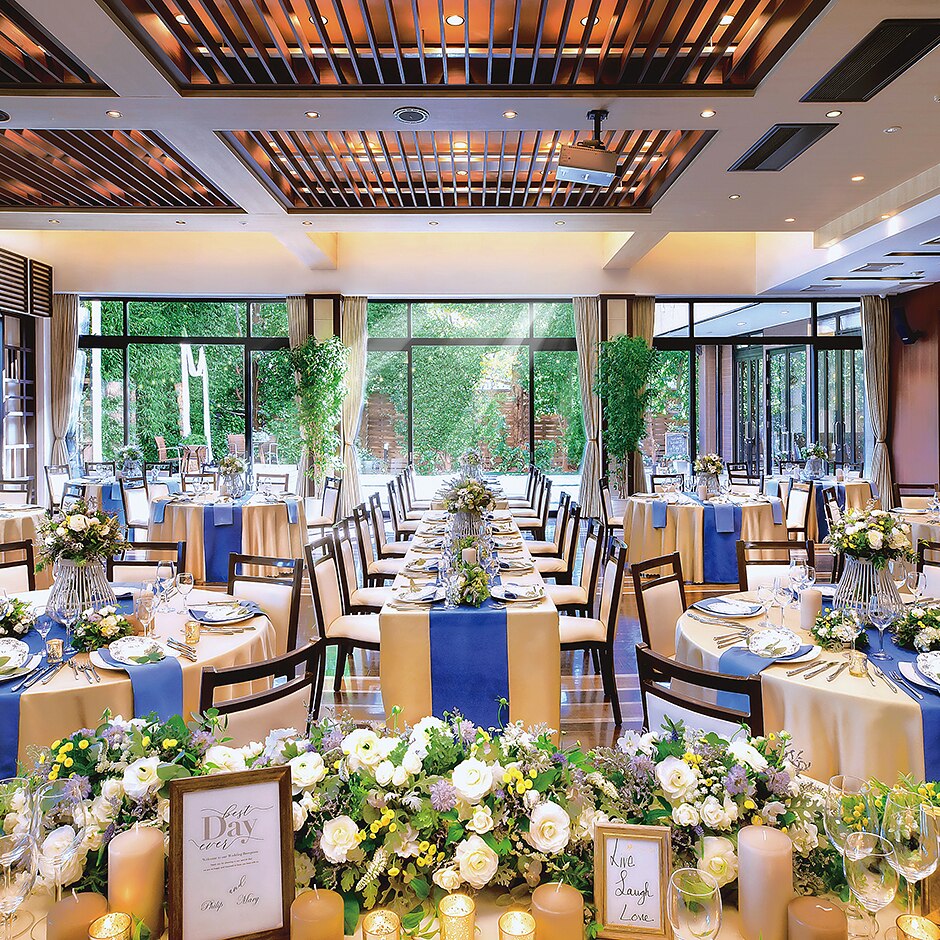 青いバラ&演出が幻想的な挙式。【緑と美食】でゲストをもてなす貸切ウエディング