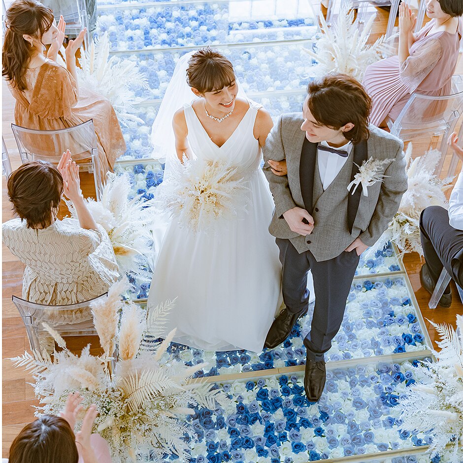 「未来」を意味する青をモチーフにしたバージンロードがふたりの永遠の誓いを祝福してくれる -