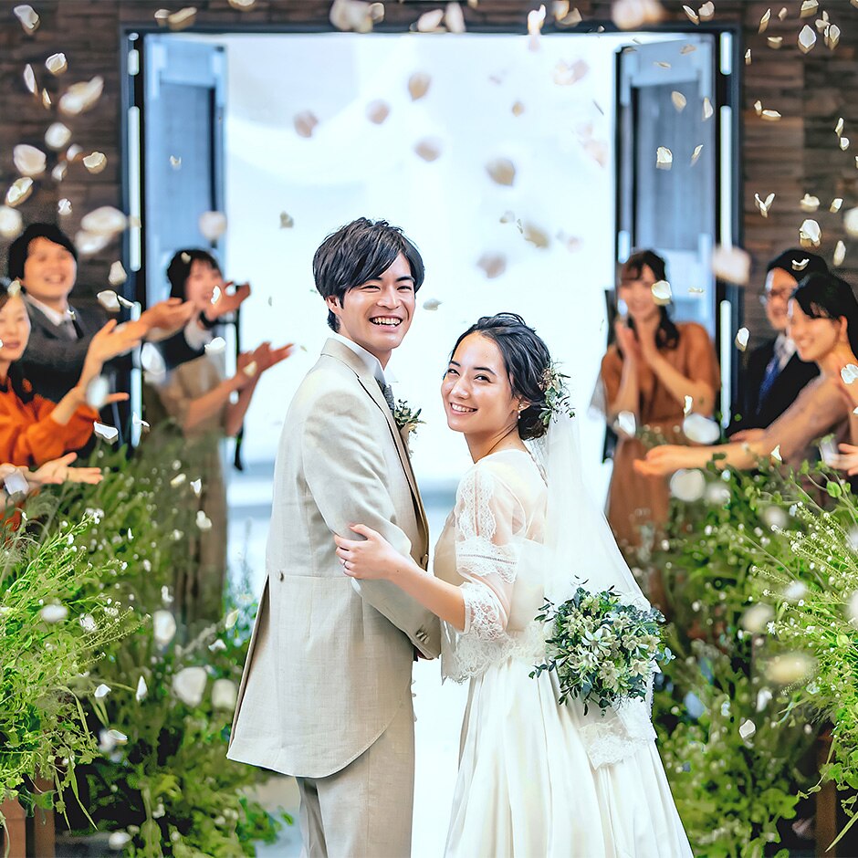 挙式後は祝福のシャワーに包まれる。サプライズ空間にも注目を -