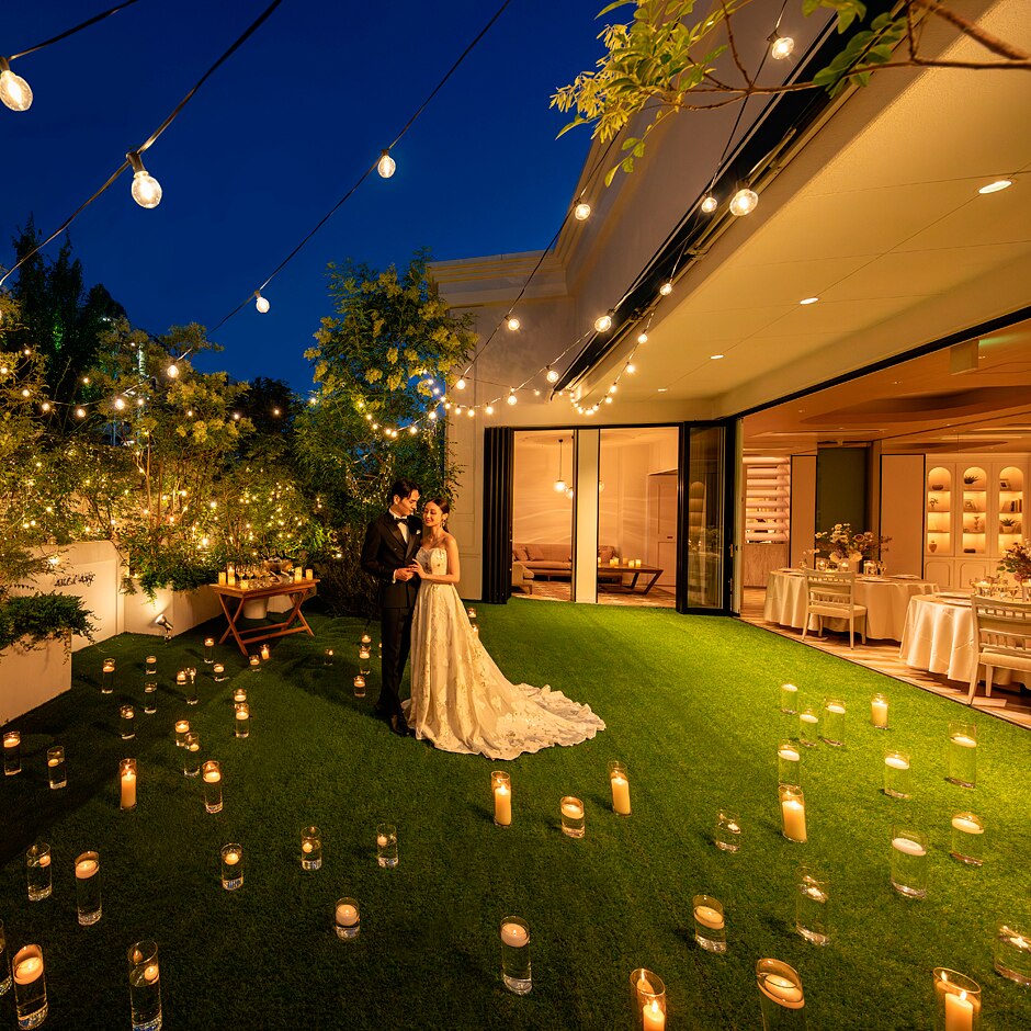 開放的なガーデンでナイトウエディングも叶えられる