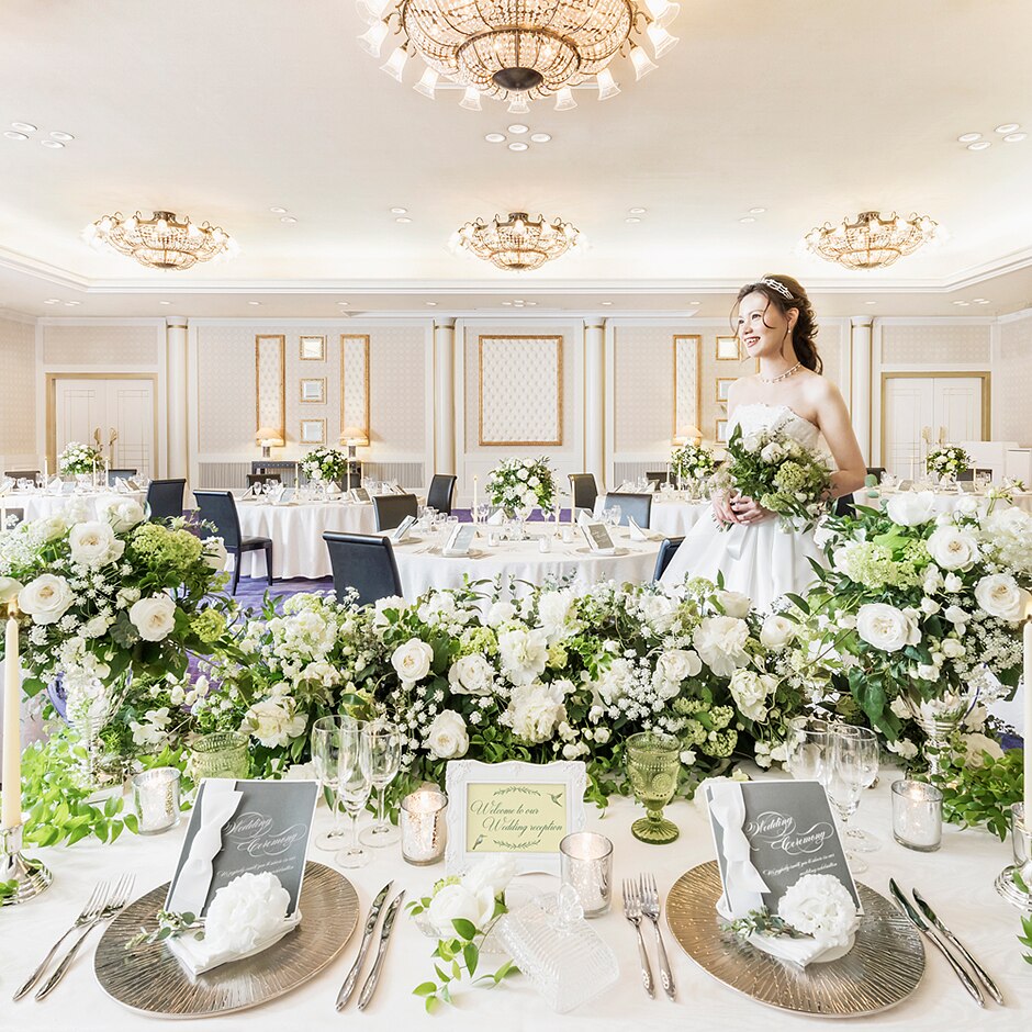 天井には豪華なシャンデリアが輝きお2人の特別な日にふさわしいラグジュアリーなひと時をお過ごしください -