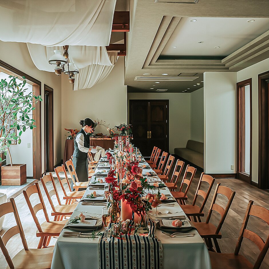 落ち着いた雰囲気の食事会会場、肩肘張らず自然体でゲストと過ごすことが出来る