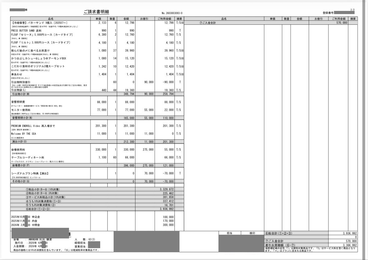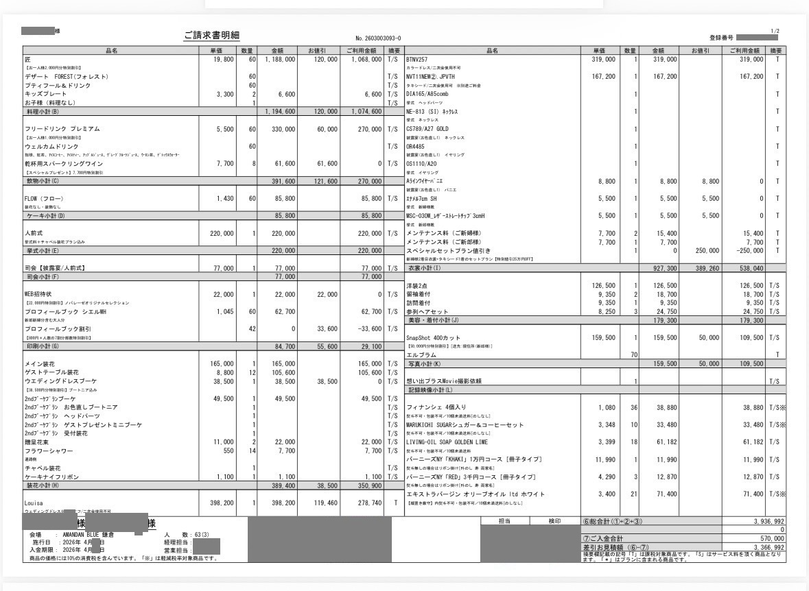 ※料金実例では申込金などを含む会場に支払った"総額"を表示しています。また、料金明細画像の項目名をもとに独自の基準で分類しています。