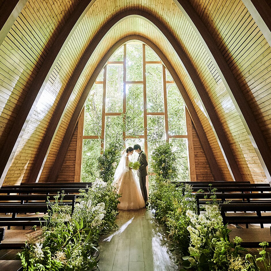 本物の自然に包まれたチャペルは、大きな窓から緑を望み、木の温もりに満ちた空間でふたりの幸せを祝福する