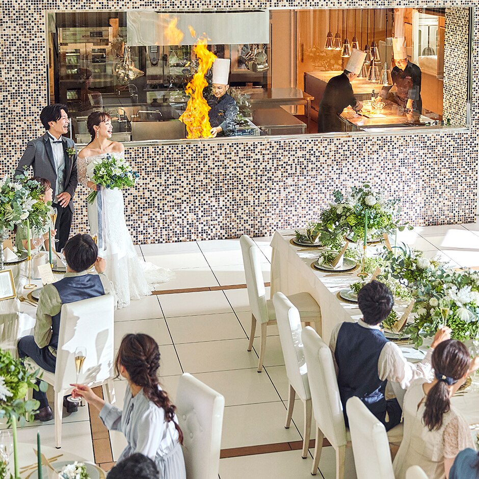 オープンキッチンでの演出もゲストと楽しんで -