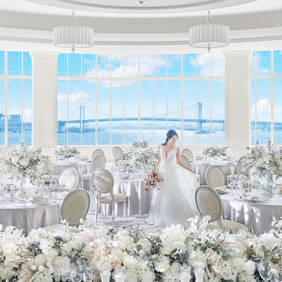 エレガントでフェミニンな雰囲気が花嫁に優雅な煌めきを与え、主役になれるバンケット。たっぷりと降り注ぐ自然光と白基調の空間で、純白のドレスを気品高く際立たせてくれる。美しい景色ごとゲストの記憶に刻まれる