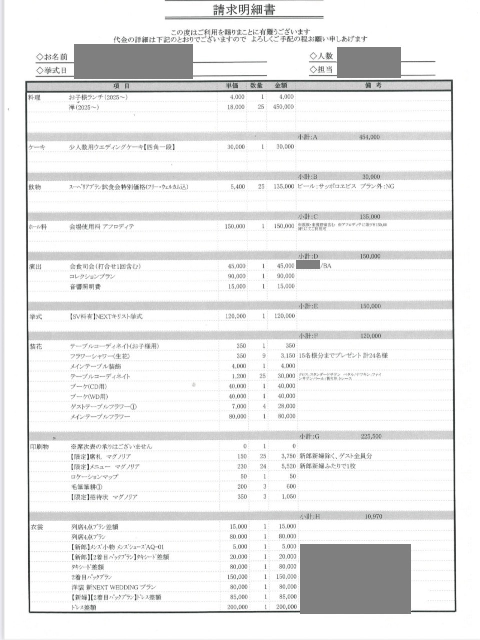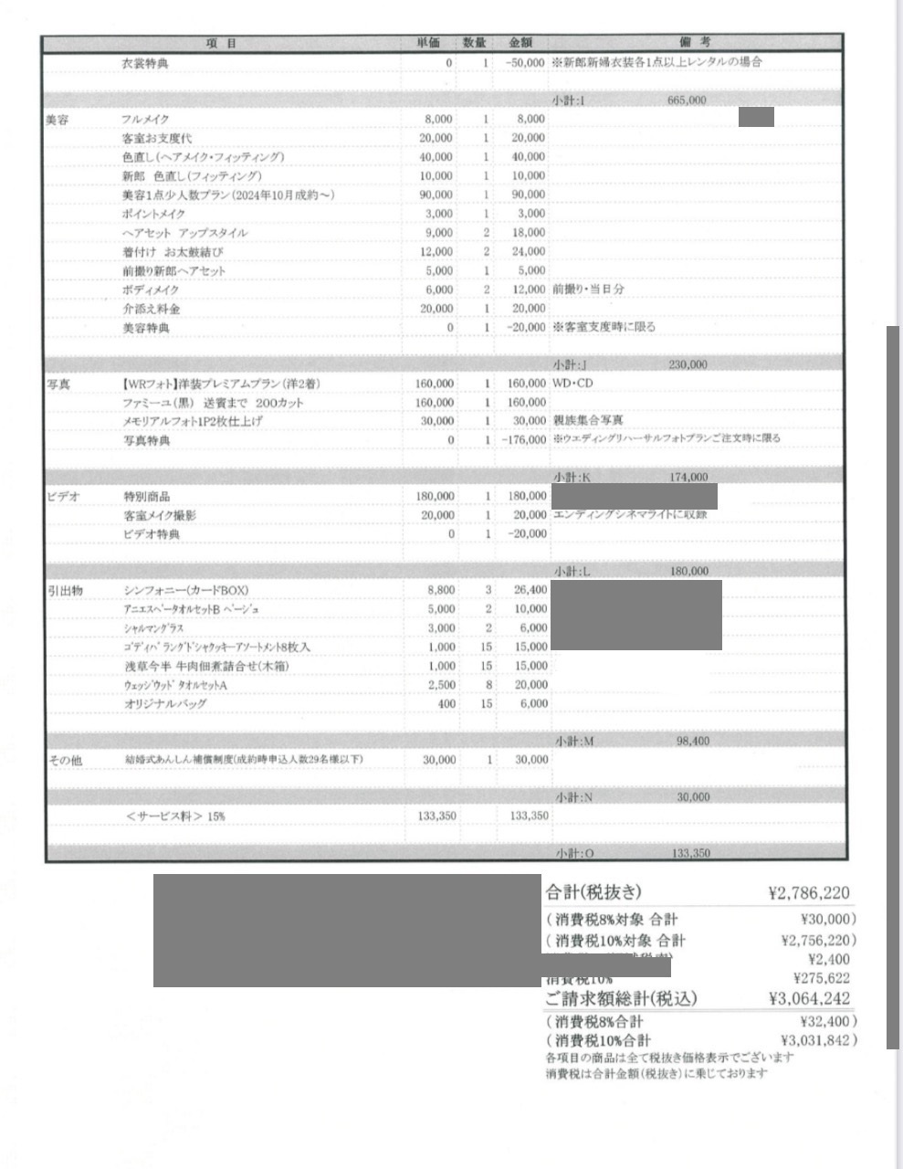 ※料金実例では申込金などを含む会場に支払った"総額"を表示しています。また、料金明細画像の項目名をもとに独自の基準で分類しています。
