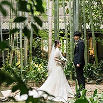 時を超えて佇む洋館が舞台となるウェディング。美しいアーチ型の正門と自然光降り注ぐ独立型チャペルや竹林は特別な時間を彩ります。