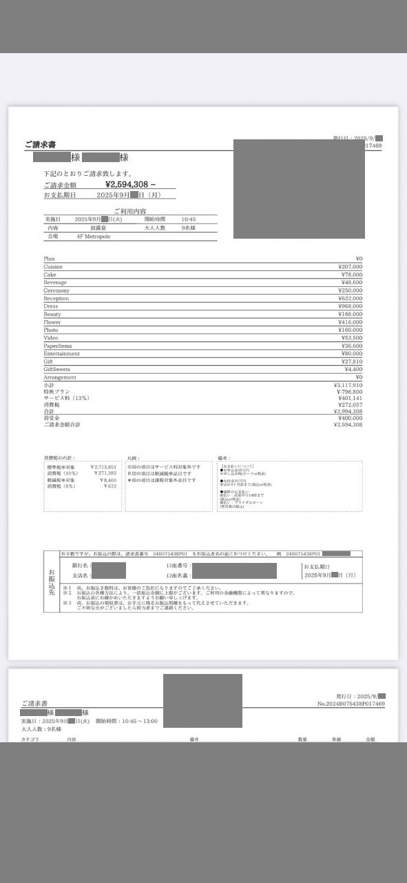 ※料金実例では申込金などを含む会場に支払った"総額"を表示しています。また、料金明細画像の項目名をもとに独自の基準で分類しています。