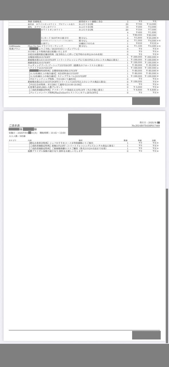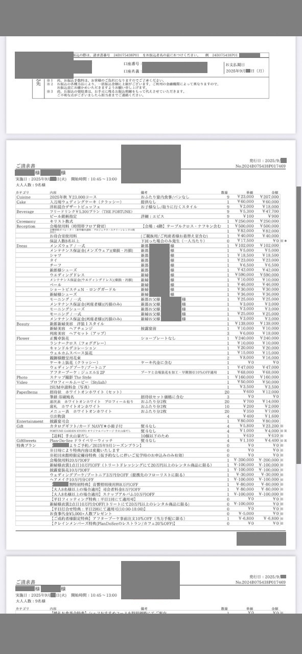 ※投稿された金額情報は、日取り、申込みのタイミングや会場の空き状況等によって異なるため、最終費用明細の項目や金額をもとにした、式場との価格交渉や追加サービス等の要望はご遠慮ください。