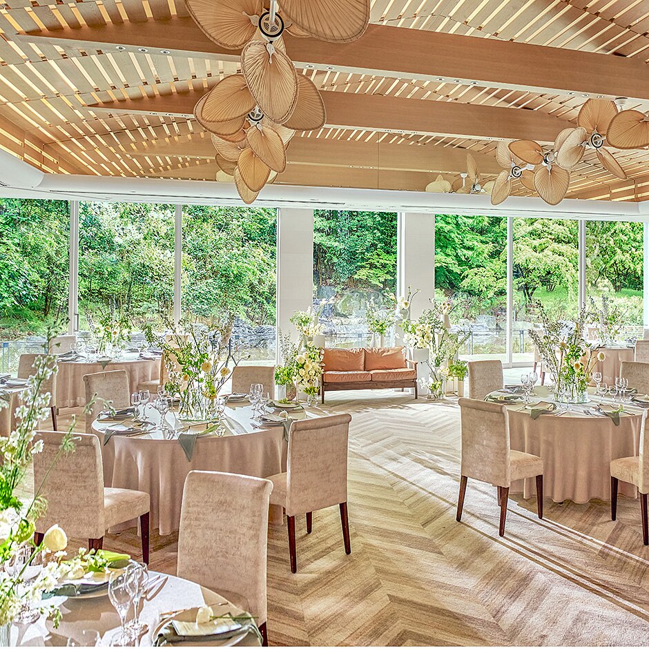 ここはかつて「花博」で国内外のVIPを迎えた迎賓館。大きな窓から光が注ぐ開放感たっぷりの会場で、和のテイストと華やかなフレンチの要素を組み合わせた、お箸で食べられる「懐石フレンチ」をゲストに振る舞おう