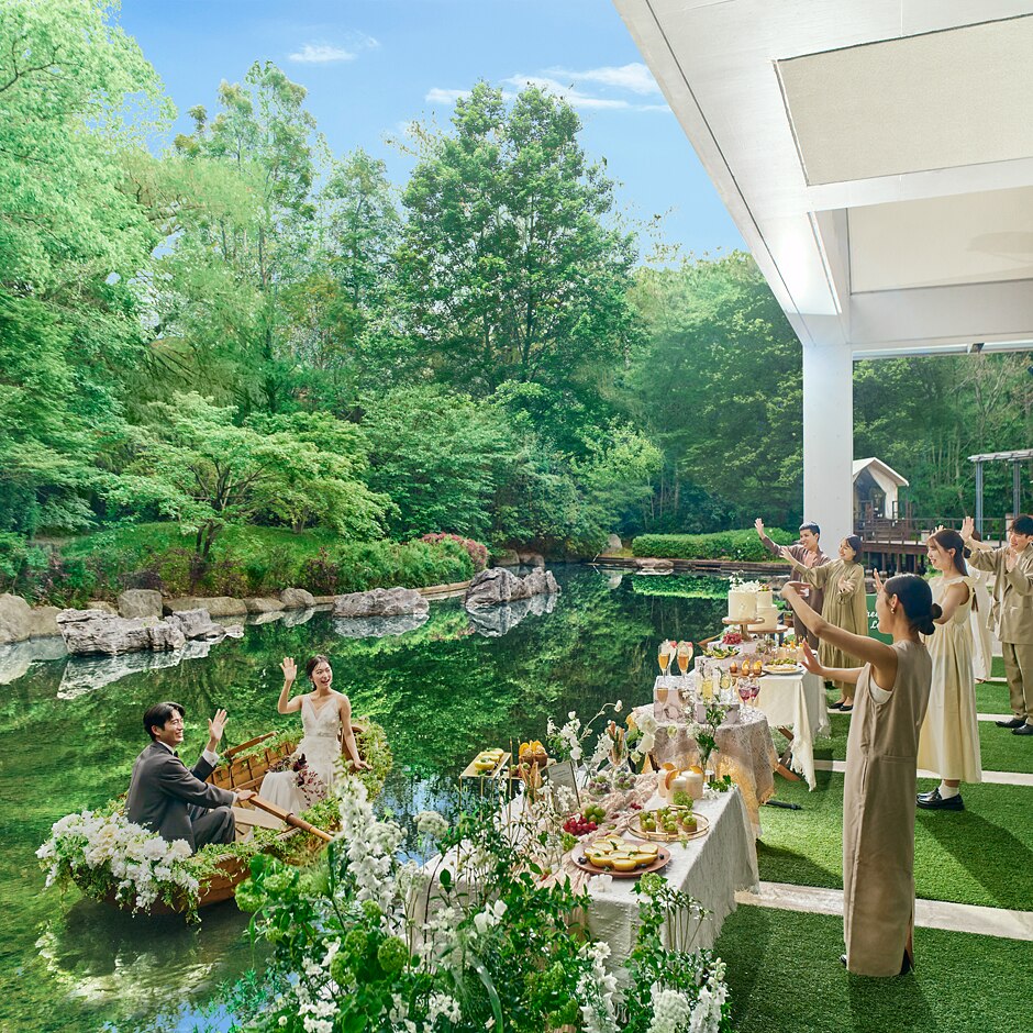 テントハウスやファイヤーピットを備えるテラス付きの一軒家を丸ごと貸切り、自由度の高いパーティが実現。広大な森もすべて貸切だから、ふたりがボートに乗ってサプライズ入場するなど、ここならではの演出も叶う