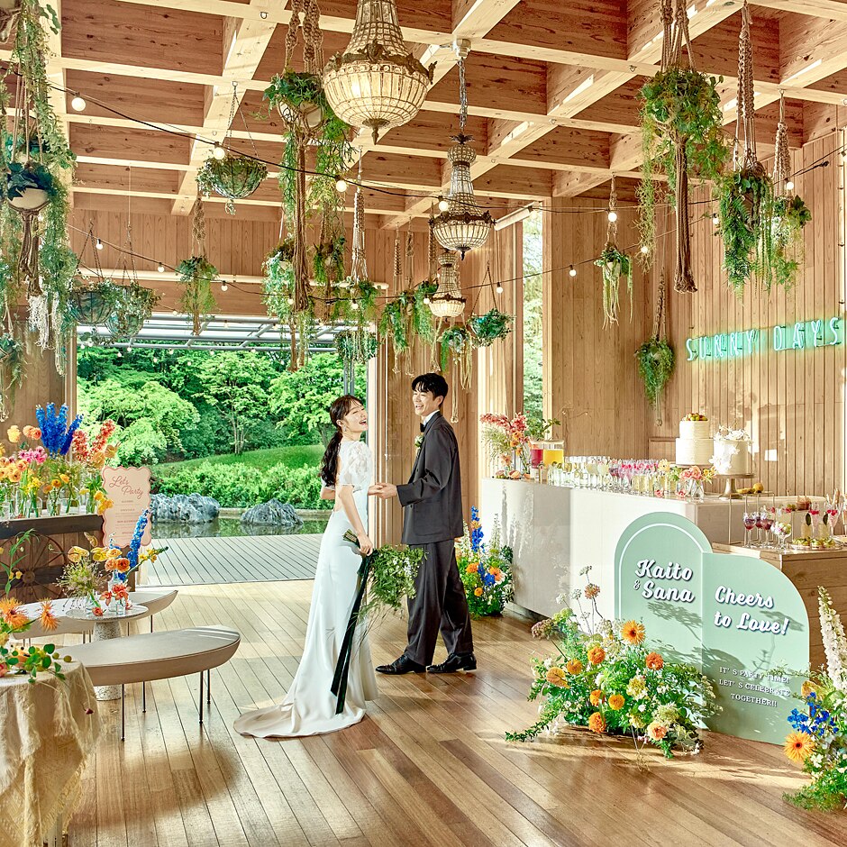 ボタニカルな設えのゲストの待合スペースと、森が香るオープンエアを自由に行き来し、グラス片手に楽しいひとときを