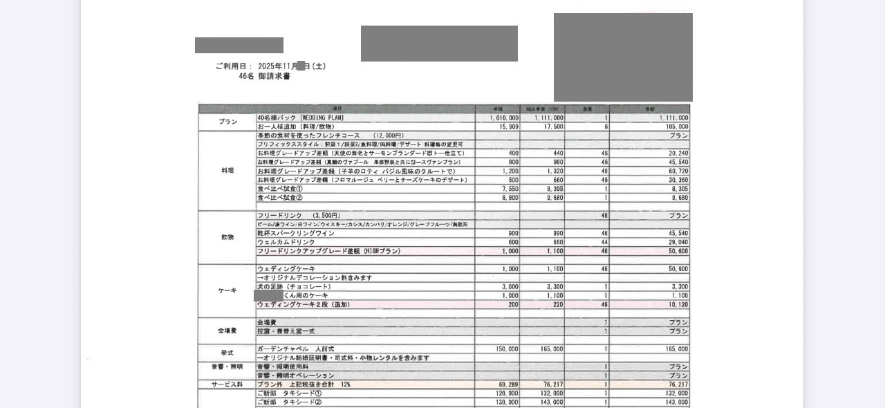 ※料金実例では申込金などを含む会場に支払った"総額"を表示しています。また、料金明細画像の項目名をもとに独自の基準で分類しています。