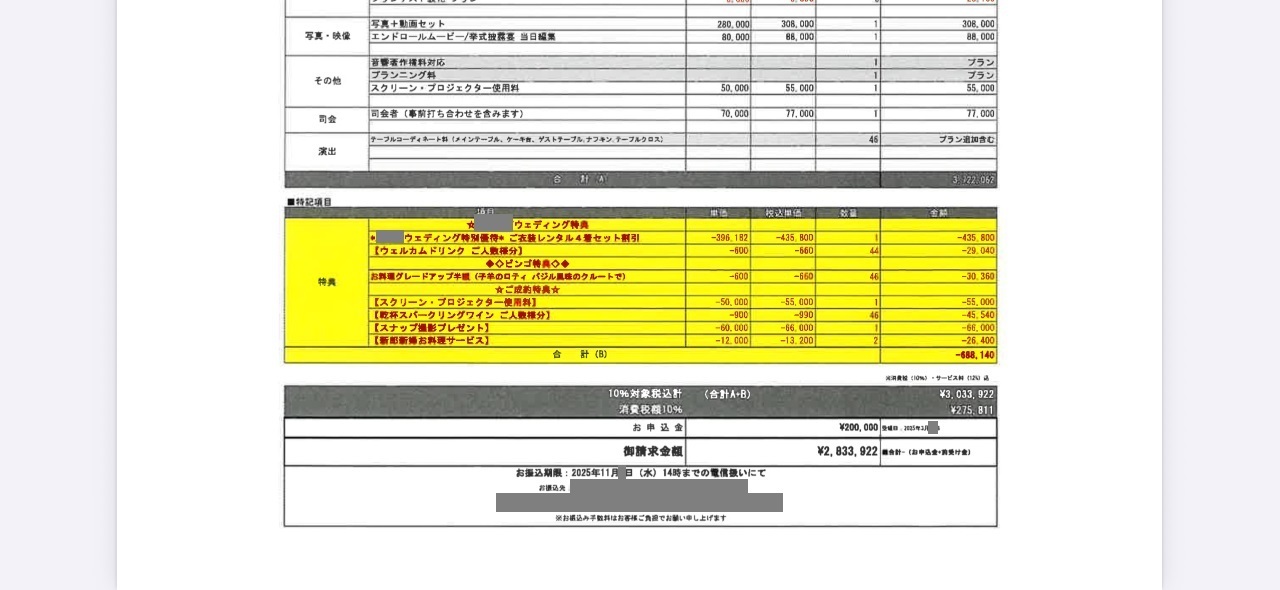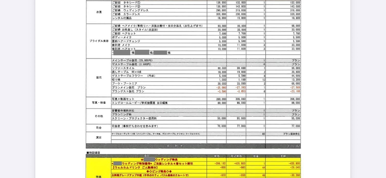 ※投稿された金額情報は、日取り、申込みのタイミングや会場の空き状況等によって異なるため、最終費用明細の項目や金額をもとにした、式場との価格交渉や追加サービス等の要望はご遠慮ください。