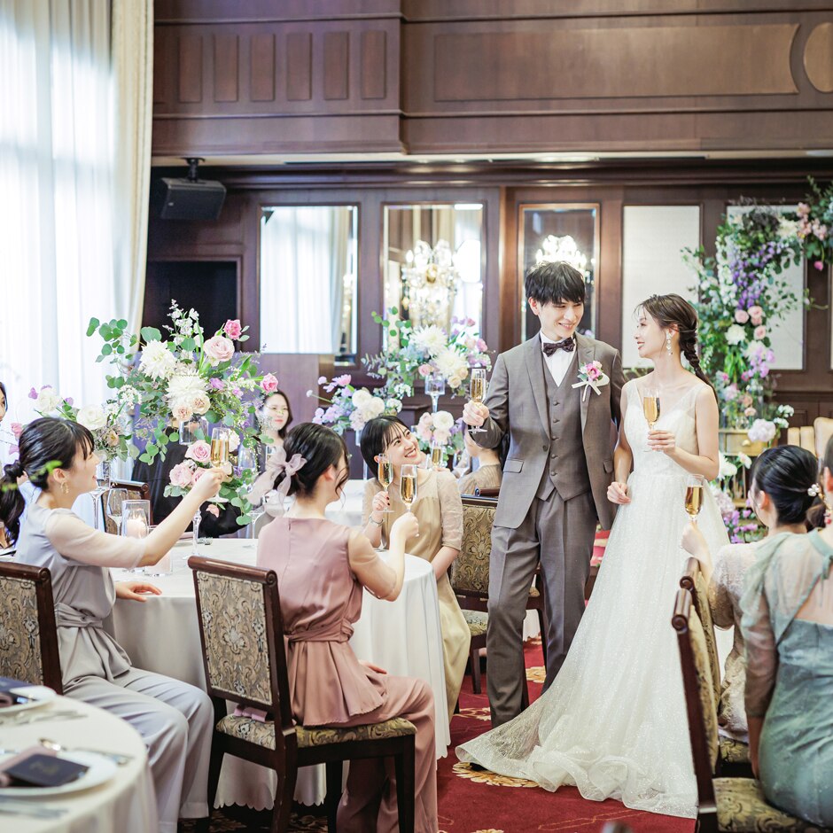華やかでおふたりらしい演出でゲストをもてなす披露宴スタイルから大切なゲストとゆっくり食事と歓談を愉しむ会食スタイルまで。優雅で贅沢なパーティーが叶う