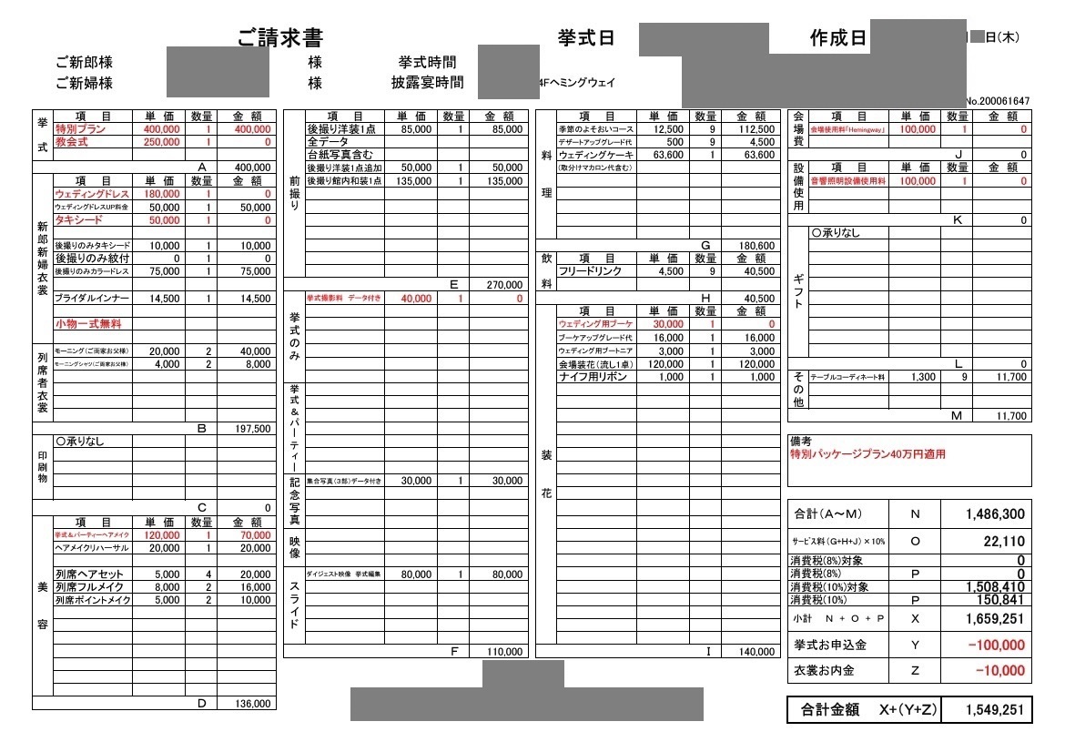 ※料金実例では申込金などを含む会場に支払った"総額"を表示しています。また、料金明細画像の項目名をもとに独自の基準で分類しています。