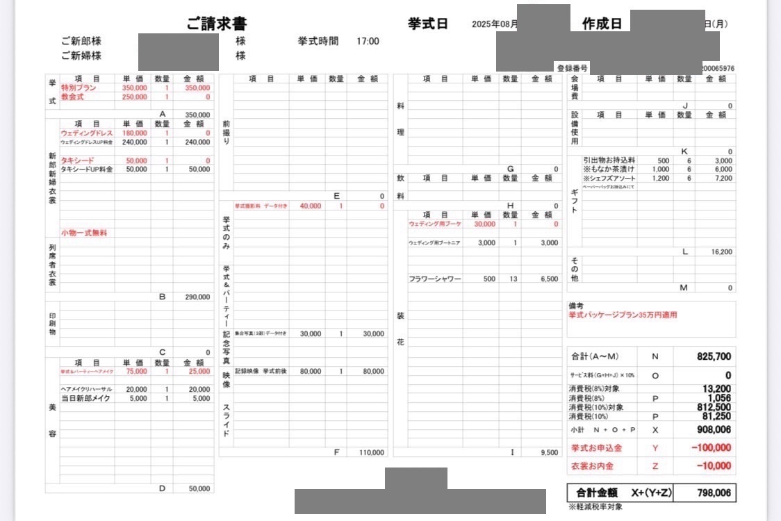※投稿された金額情報は、日取り、申込みのタイミングや会場の空き状況等によって異なるため、最終費用明細の項目や金額をもとにした、式場との価格交渉や追加サービス等の要望はご遠慮ください。